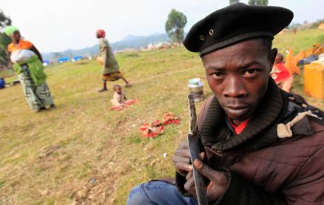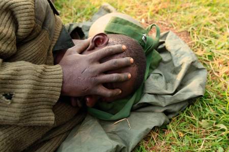 Soldier from the Democratic Republic of Congo rests on the grass in Uganda border town of Kisoro