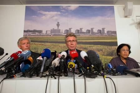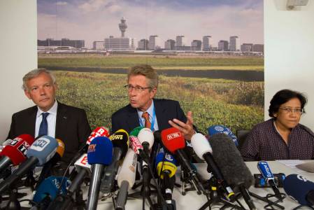 Schiphol Chief Executive Jos Nijhuis (L-R), Malaysia Airlines Senior Vice President Huib Gorter and Malaysia's ambassador to the Netherlands Fauziah Binti Mohd Taib attend a news conference at Schiphol Airport July 17, 2014. Most of the 283 passengers aboard the Malaysia Airlines jet that crashed over eastern Ukraine on Thursday were Dutch, Gorter, the airline's European chief said. There were a further 47 passengers whose nationality was not yet known. All the 15 flight crew were Malaysian. REUTERS/Cris Toala Olivares (NETHERLANDS - Tags: TRANSPORT DISASTER CONFLICT)