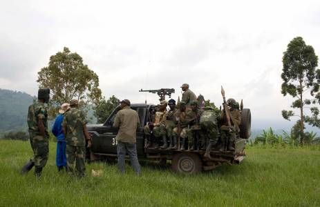 Congolese government soldiers prepare to drive from a military outpost between Kachiru village and Mbuzi hill