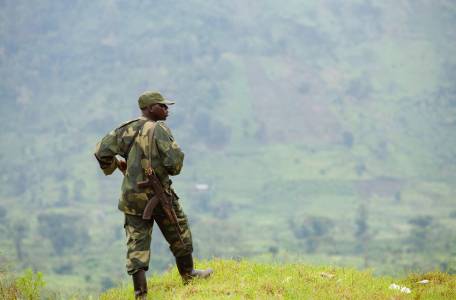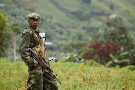 A Congolese government soldier stands guard at a military outpost between Kachiru village and Mbuzi hill