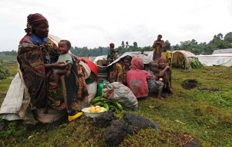 Newly arrived refugees from the DRD share a meal at a makeshift refugee camp at Bunagana near Kisoro town