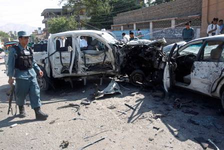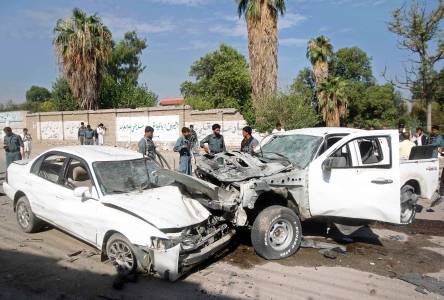 Afghan policemen inspect vehicles wreckage at the site of a roadside bomb explosion in Jalalabad