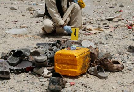 A plainclothes police officer investigates the site of an explosion in Kandahar province