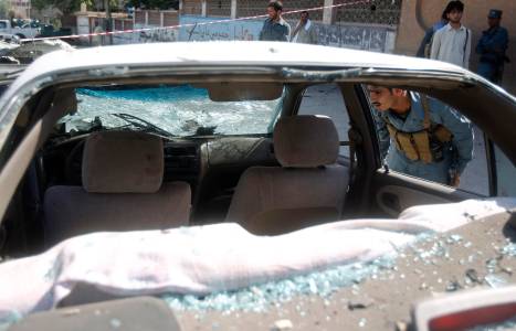 An Afghan policeman inspects vehicle wreckage at the site of a roadside bomb explosion in Jalalabad, August 4, 2013. A lawyer who prosecuted Taliban militants was seriously wounded by the roadside bomb in Afghanistan's east on Sunday, police said, a day after a deadly attack on the Indian consulate in the same city. REUTERS/ Parwiz (AFGHANISTAN - Tags: CIVIL UNREST)