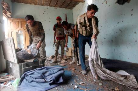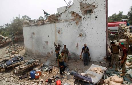 Afghan policemen inspect a destroyed police checkpoint at Bati Kot district of Nangarhar province