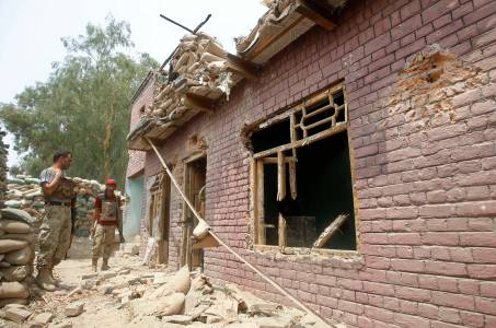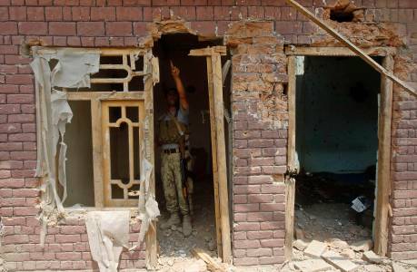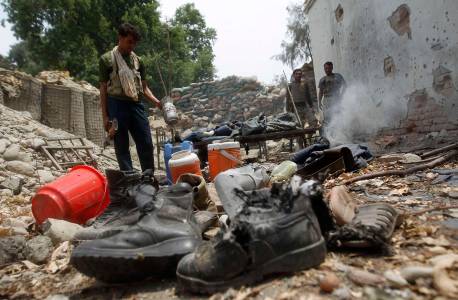 Afghan policemen inspect a destroyed police checkpoint, which a NATO aircraft had mistakenly attacked during a clash between Afghan special forces and a group of Taliban fighters at the checkpoint, at the Bati Kot district of Nangarhar province, August 1, 2013. Afghanistan's NATO-led force has launched an investigation into the accidental killing of five Afghan policemen in a U.S. air attack during an overnight operation, the force said on Thursday. REUTERS/ Parwiz (AFGHANISTAN - Tags: CIVIL UNREST POLITICS)