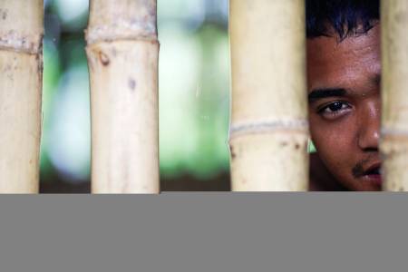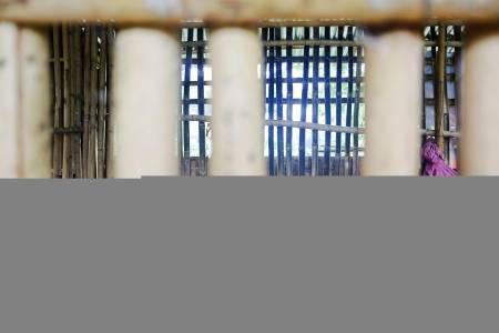 Naung Lay looks through the doors of a bamboo cell called the "Special Prayer Room", where he is locked in for his first week at the Youth for Christ Centre for heroin addicts, near Naung Chein