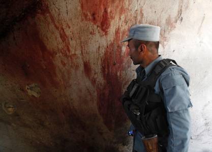 Blood on the wall of a building after an attack in Kabul