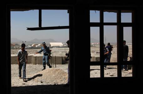 Afghan police keeps watch on a building after an attack in Kabul