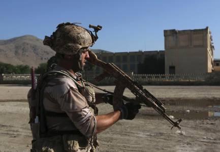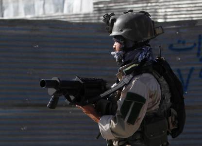 A member of the Afghan security forces holds his weapon at the site of an attack in Kabul