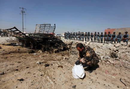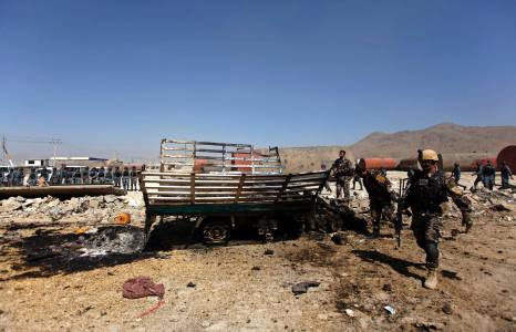 Afghan security forces investigate the site of an attack in Kabul