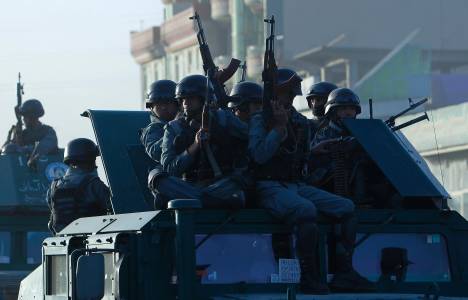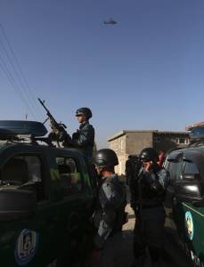 Afghan police stand guard at the site of an attack as a NATO helicopter flies overhead in Kabul
