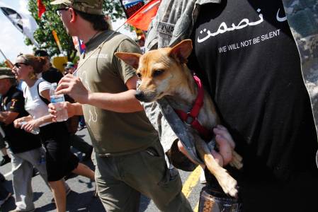 Dog is carried as protesters rally to call for the release of U.S. Army Private Manning outside the gates at Fort Meade, Maryland