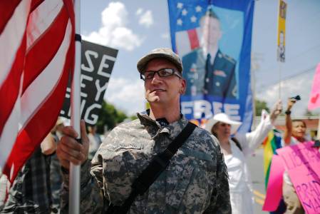 Protester dresses as Manning, a central figure in the Wikileaks case, for a rally to call for Manning's release outside the gates at Fort Meade, Maryland