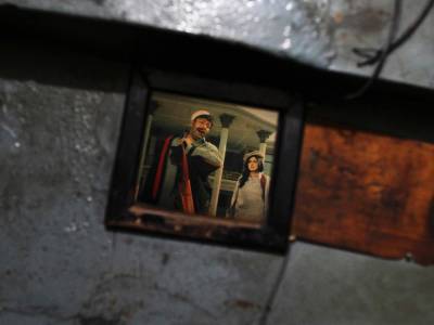 A scene of an old Pashto movie is seen through a window at Arshad cinema in Peshawar