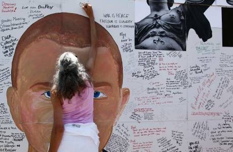 Protesters sign a mural as they rally to call for the release of U.S. Army Private Manning, outside the gates at Fort Meade, Maryland
