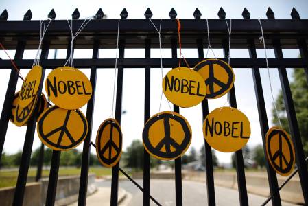 Symbolic Nobel Peace Prize signs are seen on a gate as marchers rally to call for the release of jailed U.S. Army Private Manning, a central figure in the Wikileaks case, at Fort Meade