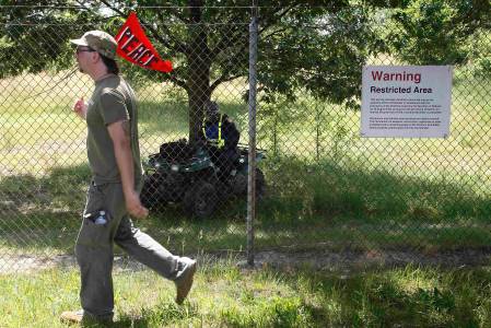 Man with a "Peace" pennant walks past a masked, helmeted guard as protesters rally to call for the release of jailed U.S. Army Private Manning, outside the gates at Fort Meade