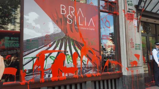 The protest was timed to coincide with a march by indigenous women in Brasilia, highlighting damage to the Amazon rainforest, Extinction Rebellion group said