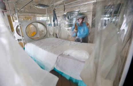 Senior Matron Breda Athan demonstrates putting on the protective suit, as she poses for the cameras, which would be used if it becomes necessary to treat patients suffering from Ebola, at The Royal Free Hospital in London August 12, 2014. Athan was photographed in a high level isolation unit in the High Secure Infectious Disease Unit, where any potential Ebola patients would be treated. It is ethical to offer unproven drugs or vaccines to people infected or at risk in West Africa's deadly Ebola outbreak, a World Health Organization panel of medical ethics experts ruled on Tuesday, but cautioned supplies will be limited. REUTERS/Suzanne Plunkett (BRITAIN - Tags: HEALTH SOCIETY)