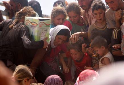 Displaced people from the minority Yazidi sect, fleeing violence from forces loyal to the Islamic State in Sinjar town, ride on a truck as they make their way towards the Syrian border