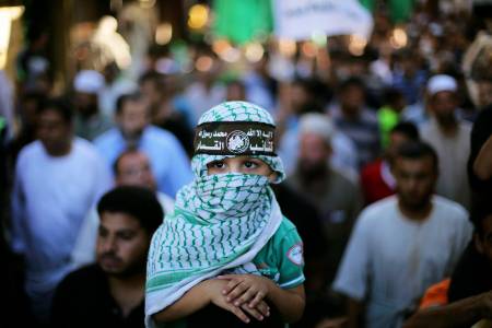A Palestinian boy wearing a Qassam brigades headband takes part in a rally in support of the armed Palestinian factions, in Khan Younis in the southern Gaza Strip August 12, 2014. Talks to end a month-long war between Israel and Gaza militants are "difficult", Palestinian delegates said on Tuesday, while an Israeli official said no progress had been made so far.As a 72-hour ceasefire held for a second day, Palestinian negotiators. REUTERS/Ibraheem Abu Mustafa (GAZA - Tags: POLITICS CIVIL UNREST TPX IMAGES OF THE DAY)
