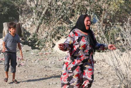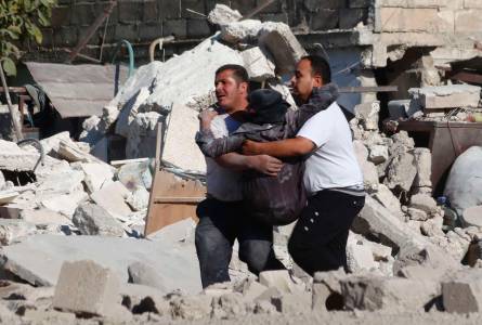 Civilians react at a site hit by what activists said was a missile fired by forces loyal to Syria's President Bashar al-Assad at Aleppo's Bab al-Nairab district