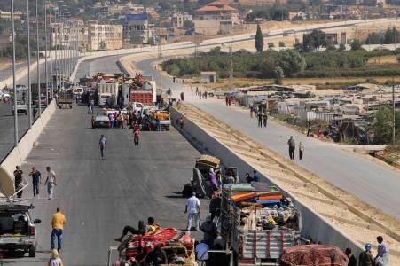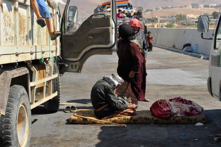 Syrian refugees, fleeing the recent fighting in Arsal, wait by trucks in Majdel Anjar in the Bekaa valley, near the Lebanese border with Syria