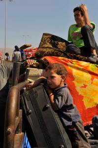 Syrian refugees, fleeing the recent fighting in Arsal, wait with their belongings in Majdel Anjar in the Bekaa valley, near the Lebanese border with Syria August 8, 2014. The refugees, who had sought shelter in Arsal, were attempting to head back to Syria; however, they say Syrian authorities at the border rejected them until further investigation to verify their identities and statuses. REUTERS/Hassan Abdallah (LEBANON - Tags: POLITICS CIVIL UNREST)