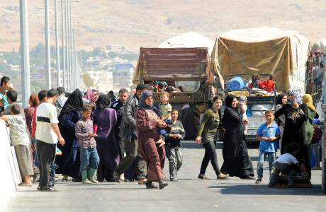 Syrian refugees, fleeing the recent fighting in Arsal, wait with their belongings in Majdel Anjar in the Bekaa valley, near the Lebanese border with Syria