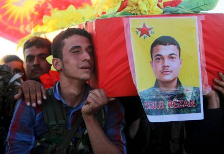 Relatives mourn the death of a Kurdish People's Protection Units (YPG) fighter, killed during clashes with Islamic State fighters in the Iraqi city of Rabia on the Iraqi-Syrian border, during his funeral in Ras al-Ain