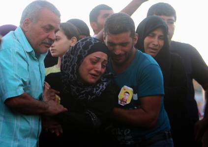 Relatives mourn the death of a Kurdish People's Protection Units (YPG) fighter, who was killed during clashes with Islamic State fighters in the Iraqi city of Rabia on the Iraqi-Syrian border, during his funeral in Ras al-Ain city in Syria's Hasakah province August 6, 2014. Kurdish forces attacked Islamic State fighters near the Kurdish regional capital of Arbil in northern Iraq on Wednesday in a change of tactics supported by the Iraqi central government to try to break the Islamists' momentum. Picture taken August 6, 2014. REUTERS/Rodi Said (SYRIA - Tags: POLITICS CIVIL UNREST CONFLICT OBITUARY)