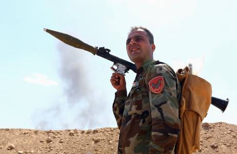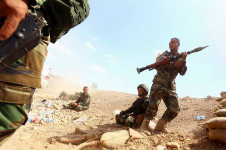 Member of the Kurdish "peshmerga" takes his position holding a RPG launcher during an intensive security deployment against Islamic State militants, on the outskirts of the province of Nineveh
