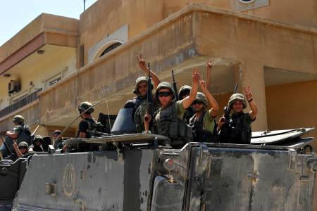 Lebanese army soldiers flash victory signs as they advance towards the Sunni Muslim border town of Arsal