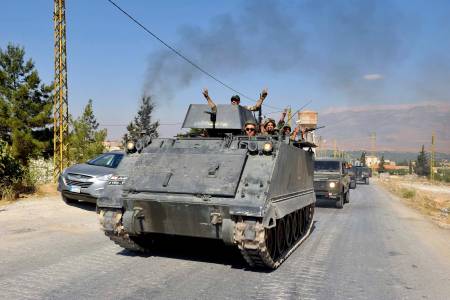Lebanese army soldiers flash victory signs while riding on armoured carriers and military vehicles as they advance towards the Sunni Muslim border town of Arsal
