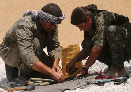 Members of the Kurdish People's Protection Units prepare ammunition during clashes with forces loyal to the Islamic State in the Syrian-Turkish border town of Elierbeh of al-Hasakah Governorate