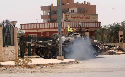 A Kurdish People's Protection Units tank is driven during clashes with forces loyal to the Islamic State in the Syrian-Turkish border town of Elierbeh of al-Hasakah Governorate