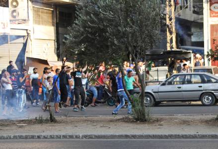 Lebanese Sunni Islamists block a road as they shout anti-Lebanese army slogans as smoke from tear gas fired by soldiers is seen, in Tripoli, northern Lebanon August 4, 2014. The protesters were condemning the Lebanese army for bombarding Arsal, as soldiers fired tear gas in an attempt to disperse them. The Lebanese army advanced on Monday into a border town attacked by Islamists at the weekend in the most serious spillover of the three-year-old Syrian civil war into Lebanon, and the Beirut government said the deadly assault would not go unpunished. REUTERS/Omar Ibrahim (LEBANON - Tags: POLITICS CIVIL UNREST)