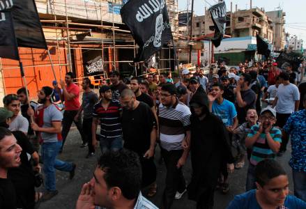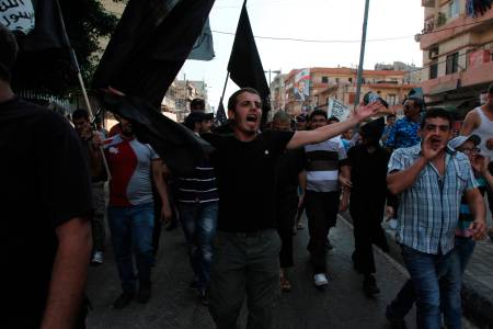Lebanese Sunni Islamists shout slogans and wave flags as they march during a protest in Tripoli, northern Lebanon, August 4, 2014, condemning the Lebanese army for bombarding Arsal. The Lebanese army advanced on Monday into a border town attacked by Islamists at the weekend in the most serious spillover of the three-year-old Syrian civil war into Lebanon, and the Beirut government said the deadly assault would not go unpunished. REUTERS/Omar Ibrahim (LEBANON - Tags: POLITICS CIVIL UNREST)