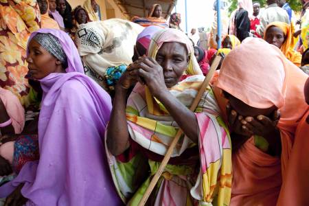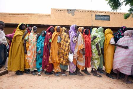 Women and children residents stand in line to be examined by doctors in Kassab camp for Internally Displaced Persons (IDP), in Kutum, North Darfur