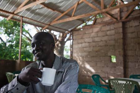 Mading Ngor holds a cup of tea in his hand after finishing his Bakhita Radio morning radio program "Wake up Juba", in Juba