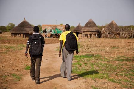 IRC Community Case Management Officer Pitia Jacob walks with Paulino Angui Akot in Majak Ajuong