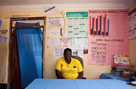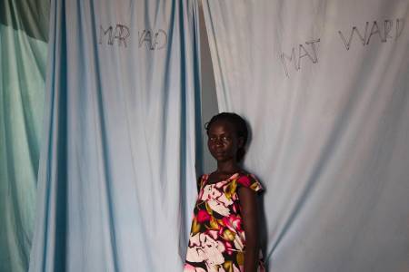 Jua Rose Peter poses for a photograph at the entrance to the maternity ward of the Malualkon Primary Health Care Center in Malualkon