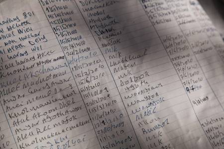 A registration book is seen on a table under a tree at the Malualkon Primary Health Care Center in Malualkon