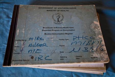 An immunization register is seen at the Malualbai Primary Health Care Center in Malualbai, in the South Sudanese state of Northern Bahr el Ghazal