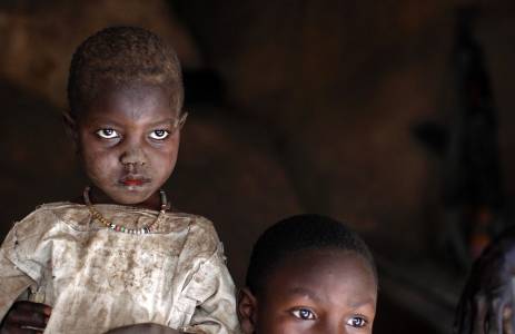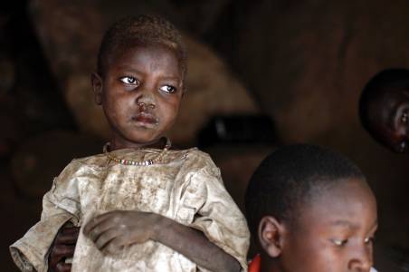 Girl and her brother sit in a cave shelter in Tess village in the rebel-held territory of the Nuba Mountains in South Kordofan