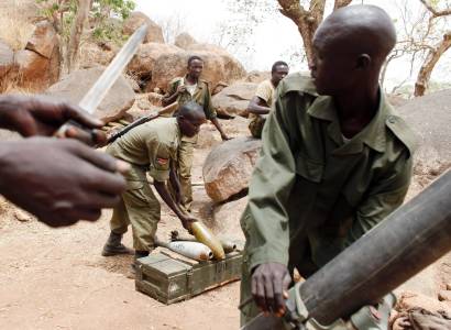 A SPLA-N fighter picks up a mortar shell near Jebel Kwo village in the rebel-held territory of the Nuba Mountains in South Kordofan