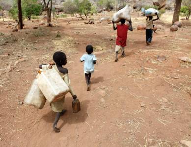 Children carry their family's belonging as they go to Yida refugee camp in South Sudan outside Tess village in the rebel-held territory of the Nuba Mountains in South Kordofan