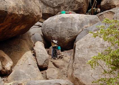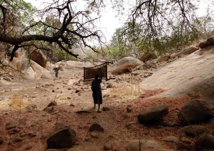 Men carry beds towards a cave in Tess village in the rebel-held territory of the Nuba Mountains in South Kordofan