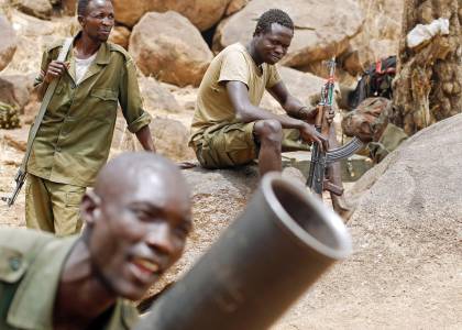 A SPLA-N fighter holds up his rifle near Jebel Kwo village in the rebel-held territory of the Nuba Mountains in South Kordofan